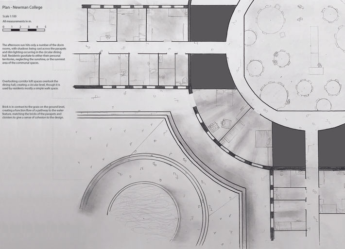 Multiple views of a suggested design created to sit inside the Newman College grounds. The design actively employs the natural light of the Quadrangle, and the dynamic nature of this as it changes throughout the day. Including hidden crawl spaces, ground level and multiple climbable elements, the design is created with a multitude of audiences and users in mind. The designs have been hand rendered.